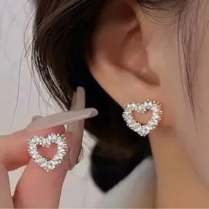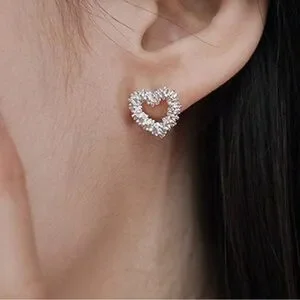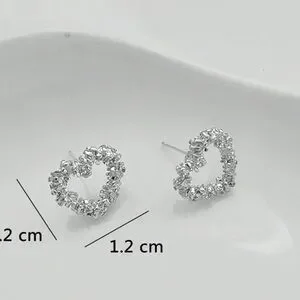These exquisite silver earrings feature a delicate open heart design adorned with sparkling clear gemstones that catch the light beautifully. Their small size and elegant shape make them a versatile accessory suitable for various occasions. The airy feel of the design is enhanced by the unique gap at the bottom of each heart, adding a charming touch.