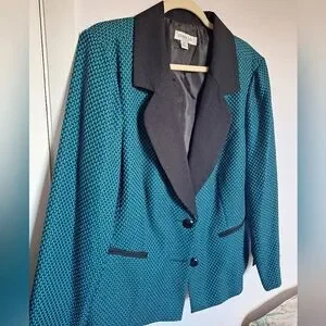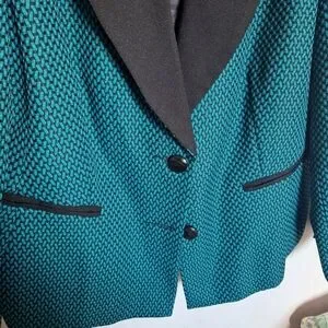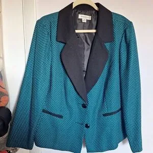 This tailored blazer features a vibrant teal body with a subtle polka dot pattern in a darker shade. The contrasting black collar and lapels create a striking two-tone effect, making it a stylish choice for any occasion.