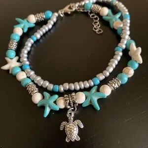 Boho style layered anklet with sea turtle charm & aqua blue starfish