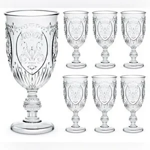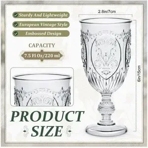 Brand New 4 Pcs Clear Plastic Goblets 7.5oz Vintage Goblet Plastic Wine Glasses Colored Retro Embossed Water Goblets for Wine Bar Juice Baby Shower Wedding Reception Grand Event Party (Clear)