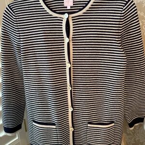 Beautiful cashmere and wool striped lady cardigan, classic Ann Mashburn! Beautifully made, button up, patch pockets! Perfect shape, true to size. Blue and cream/white stripes! Nonsmoking and pet free home!