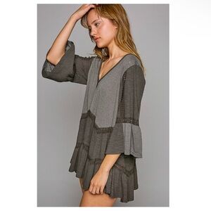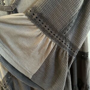 This POL top features a stylish silhouette in a chic black and gray color scheme. The relaxed fit is complemented by bell sleeves, making it a versatile choice for various occasions. Its asymmetrical design adds a modern touch to your wardrobe. Lace detail and multi fabric combination. New boutique item. Measures approximately 23 inches pit to pit. Stretches easily to 26 inches. Super soft.
