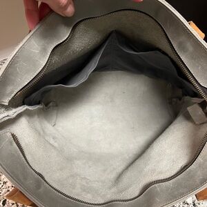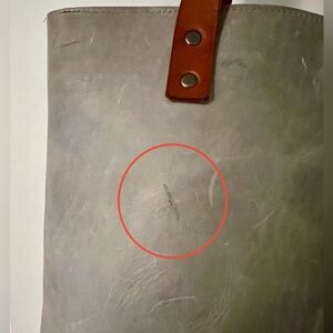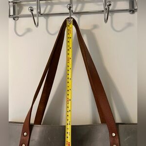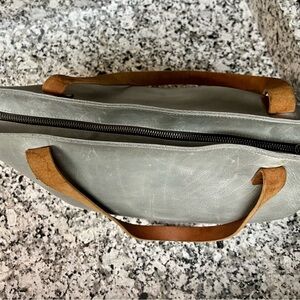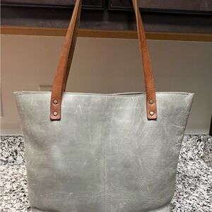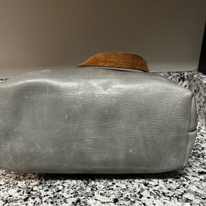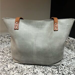 Custom handmade full grain leather tote bag purchased from VermutAtelier (Spain) through Etsy. Two internal pockets, Grey body with tan handles, YKK zip closure. Measurements in photos. This has been well-loved, but it has so much life left! Lots of character marks, but makes a perfect travel tote, especially for air travel (who wants a brand new bag to get beaten up when you have to place it under the seat in front of you?)
