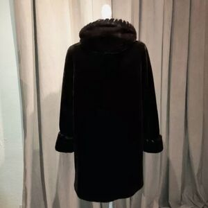 This vintage Covington winter coat is a stylish and cozy outerwear piece perfect for the cold seasons. The coat features a dark brown faux fur fabric with suede spiral lace trim on sleeves, hood and front closure trim, giving it a luxurious look. It has long sleeves, a mid-length design, and a large hood for added warmth. The coat has practical pockets for convenience. With a size of 1XL This coat is designed to be oversized and insulated, making it wind-resistant and suitable for various occasions from casual to formal wear. Perfect for staying fashionable and comfortable in the winter.