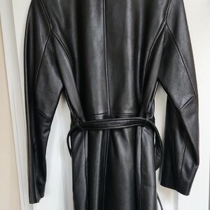 This black leather jacket size Small features a classic tailored design with a smooth and slightly shiny finish. It includes long sleeves and a matching black leather belt at the waist to define the silhouette. The standard shirt-style collar adds a touch of sophistication to this stylish piece.