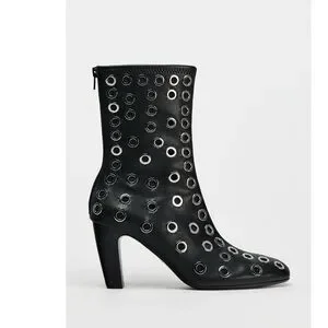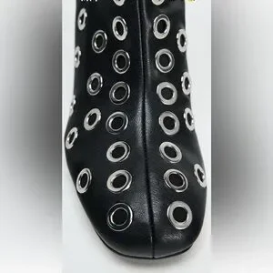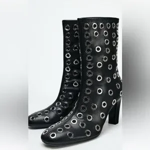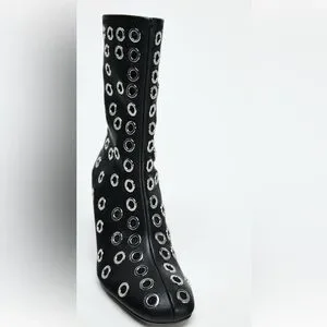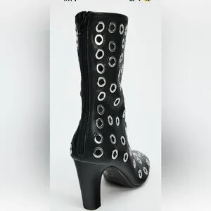 Heeled ankle boots. Metal grommets all over the exterior. Back zip closure.
