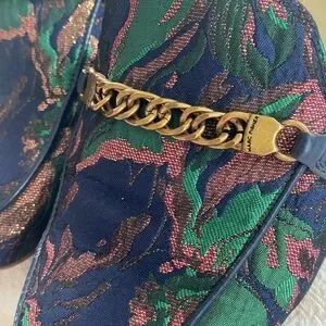 Marc Fisher Whiley Slip-In Mules Metallic Brocade Womens w Gold Chain 7M, low heel, EUC. So chic, ❤️