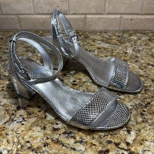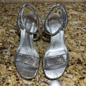 Michael Kors silver snakeskin leather ankle strap block heel sandals. Like new condition. Smoke and pet free home.