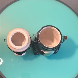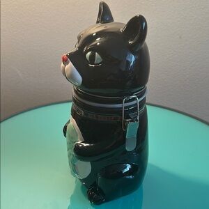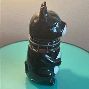 Charming black cat jar featuring a fish design. Perfect for storage or decor. In excellent used condition.