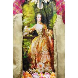 Boucle button-up embellished blazer, front closure with crystal buttons, 1 upper front patch pocket, 2 lower front flap pockets (flaps with embroidered trims), right front hem with embroidered patch, 2 contrast elbow patches, center back lining with Francois Boucher Madame De Pompadour print, blazer fully lined with satin fabric