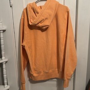 this hoodie is in great condition, nice bright color, little bit stiff feeling on the outside but comfy inside. fits a little oversized