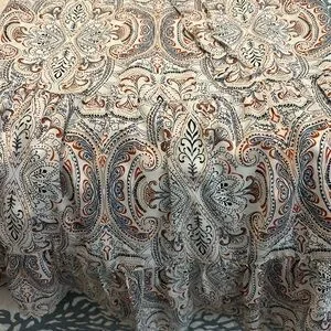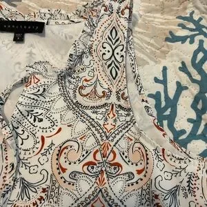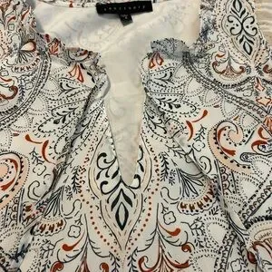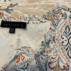 Elegant Sanctuary sleeveless paisley print dress. Features intricate patterns. Beautiful dress in great condition. You can tie in front or just leave open. Pics show both ways. The ties have a cute little end on them as seen in pics. The print on dress is in navy and orange. Cute little ruffle around neck. Perfect for any occasion. Size Small