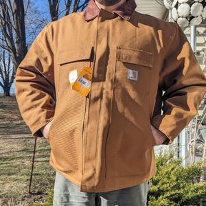 Men's 2XL Carhartt jacket. firm duck insulated traditional Carhartt coat. This jacket is where it's at! Arctic Weight insulation for superior warmth.. Carhartt warmth rating is a three out of four on this jacket. Storm cuffs for added protection, shoulder pleats for extra movement. heavy duty zipper & Velcro closure.. corduroy brown collar.. inside drawstrings for pulling tight. two interior pockets one with a Velcro top in the other has a zipper. This jacket is the workman's jacket! thick, heavy, and durable!