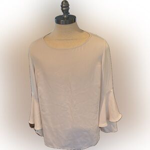 Simple neckline with double tiered bell sleeves made of beautiful fabric that does t require a camisole! Washed beautifully after wearing once! A staple piece!