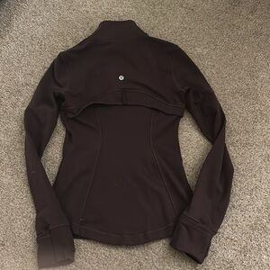 Lululemon Define Jacket in color espresso size 2. Worn once, I have a short torso. Washed cold and hanged to dry.