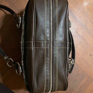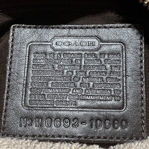 This is a 2006 Hamilton doctor satchel shoulder bag from Coach. It features brown, soft milled, cowhide leather exterior with zip top closure, bottom studded feet, dual top handles that have an 11" drop and original hangtag. Exterior is in very good condition for age, one slight scuff shown in photo. Interior is dark brown fabric lining with slip and zip pockets, which is very clean. Bag is in great overall pre-owned vintage condition, showing some wear consistent with gentle use and storage.