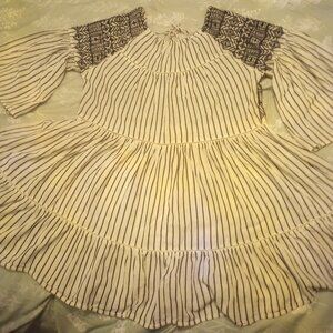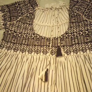 Lightly used once pre owned flowy boho mini dress, lovely embroidery, tie fabric string & tassel back closure! Worn and cleaned twice, in plastic bag! Fabric very soft cotton! Has inside tags and name brand! Size medium! Above knee length! A great spring and summer dress! Original price was $148 Has no flaws! Very good condition! Can also be worn with leggings or pants as a long top look!!! See pics!