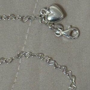 NWOT – solid 925 Sterling silver heart anklet w/heart charm & heart tag. The whole anklet is made up of tiny little connected hearts, that is what the chain is. The heart charm has a few scratches on the top side. Lobster clasp. This anklet is made so you can clasp it off anywhere along the chain, The rest can dangle.