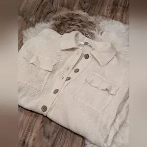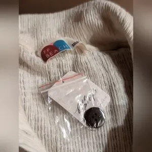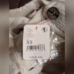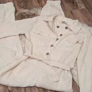 Free People cream jumpsuit with button-up front. Features a belted waist and long sleeves. Brand new with tags. Fits more like a Small