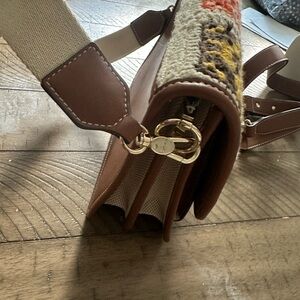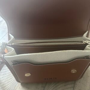 Medium Audree TOUS Crochet crossbody bag in beige and brown made from hand-crocheted material combined with synthetic leather. Features a flap and closes with two magnetic buttons. The interior has three open compartments and one with a zipper. Featuring a detachable webbing shoulder strap and an adjustable and detachable crossbody strap. Measurements (height x width x depth): 20 x 25 x 10 cm. This Tous crossbody bag showcases a sophisticated brown leather body complemented by a vibrant crochet flap featuring an array of floral patterns in various colors. Its structured rectangular shape adds a touch of elegance, making it a perfect accessory for any occasion.