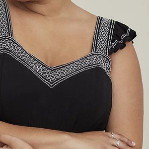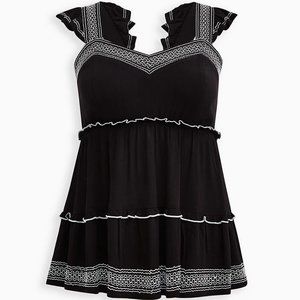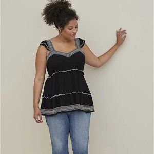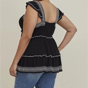 Women’s Plus Size Clothing Torrid Ruffle Sleeve Babydoll Peplum Crinkle Gauze Embroidered Tiered Top Deep Black Torrid Size 5 - 5X - 28