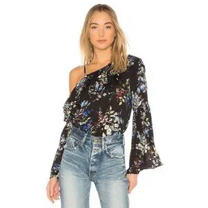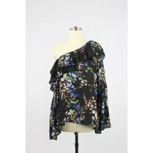 PARKER Lima Boboli Black Floral Silk Georgette Off The Shoulder Blouse, Size L