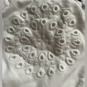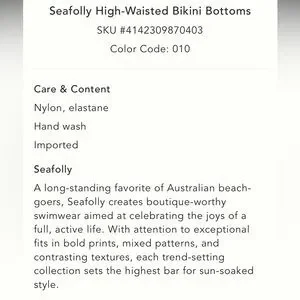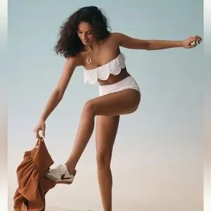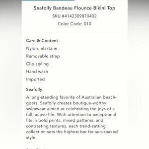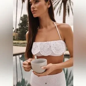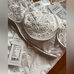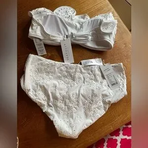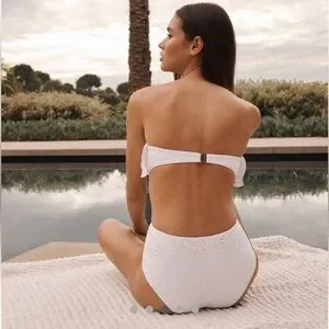 Beautiful, classy white Seafolly, top Australian swimsuit designer swimsuit. Top is bandeau style , removable padding, detachable strap, ruffled flounce with eyelet detailed pattern. Bottoms are high waisted for flattering look. Sold out. Smoke free home.