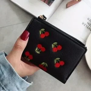 Stylish black wallet with cherries, perfect for adding a playful touch to your accessories.