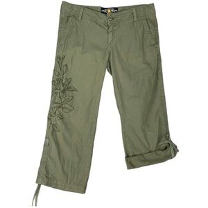 low waist army green Y2K cargo capri pants with floral embroidery. Wear cuffed or uncuffed. Uncuffed inseam 22 inches