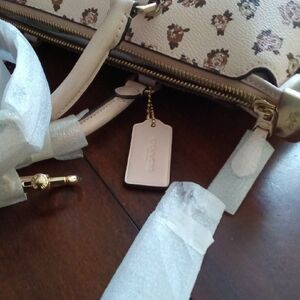 This Coach satchel showcases a structured rectangular shape with rounded corners, crafted from high-quality material that has a glossy finish. It features a beautiful repeating pattern in brown on a light beige background, complemented by two short handles and a longer adjustable shoulder strap for versatile wear.