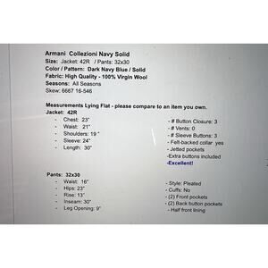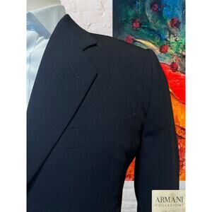 Crafted with precision and classic style, the Armani Collezioni 42R suit set is a testament to sophistication and quality. This dark navy blue suit is made from luxurious wool fabric, offers a timeless appeal with its classic notch lapel, single-breasted design, and pleated front pants. This two-piece suit is an exemplary choice for a variety of occasions. Whether you're attending a business meeting, a wedding, or a cocktail party, this suit promises to elevate your look and make a statement. The detailing, such as the three-button sleeve style and jetted pockets, underscores the craftsmanship synonymous with Armani Collezioni. Made in Italy, this suit is a versatile addition to your wardrobe, seamlessly transitioning through seasons and events.