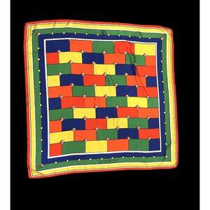 Bright, primary colored silk scarf with a geometric motif. 100% silk * Hand finished hem * Made in Italy
