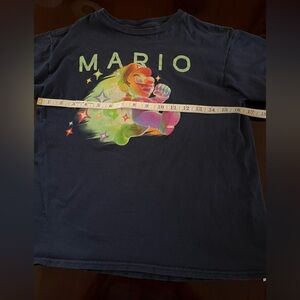 The shirt is a navy-blue graphic t-shirt featuring Mario from the Super Mario Bros. series.