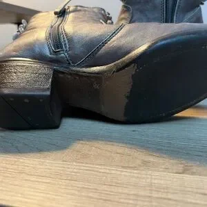These stylish gray ankle boots feature a unique floral decoration that adds a textured look to the leather surface. With a short stacked heel and a convenient inner zipper, they combine comfort and elegance effortlessly.
