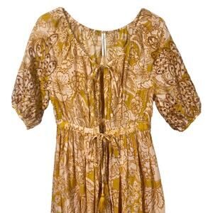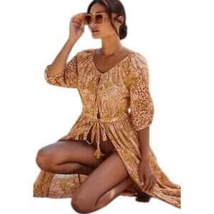 Anthropologie Ember Kaftan. Floral print. Eyelet embroidered detail. Tie front closure with tassel detail. Can be worn as a swim coverup or as a maxi top/cardigan style.