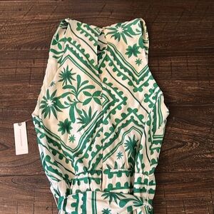 Stylish romper with a vibrant green and off white pattern. Features a halter neck and waist tie. Perfect for a casual outing.