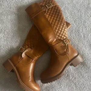 Cognac color knee high boots. Zip up, with criss cross stitching and decorative buckles. Size 6. Worn once.