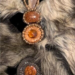 Stylish faux fur handbag. Colors are black, gray & brown. Features Black Patent Leather Handle, Zipper Closure, Embedded Natural Stone Accents, Zippered Pocket, 3 additional inside pockets. Sharif Logo on bottom of bag. Protective covering intact on hardware.