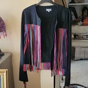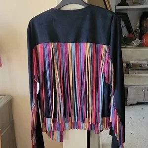 Fashionable microsuede jacket with colorful fringe detail, NWT, length 22", size L.