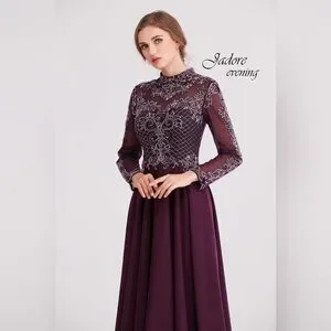 Plum beaded bodice evening gown - long sleeve high neck