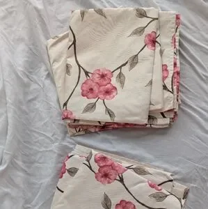 Elegant cream curtains with pink cherry blossom design. Perfect for home decor.