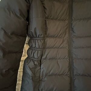 The North Face black hooded puffer coat with removable faux fur trim. This super warm comfy coat has plenty of insulation and pockets, zipper closure, and drawstring to keep you warm and dry through the winter in the cold, wind, and snow while still looking stylish enough to wear out on cold winter nights.