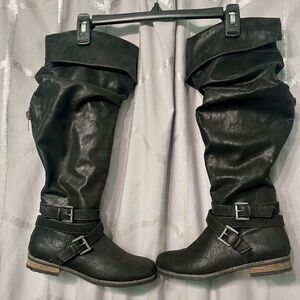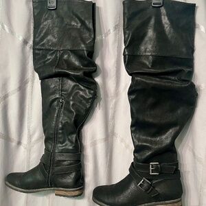 Nearly brand new. Work only one time. Size 7 medium. Comes with original box. Color, black suede, can be worn over the knee or folded down just under the knee. Buckle accessories around the ankle, zipper down the back of the boot and zipper on the inner side of the boot. Non-smoking home, kept in box.