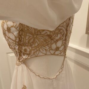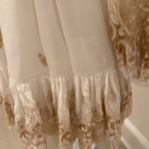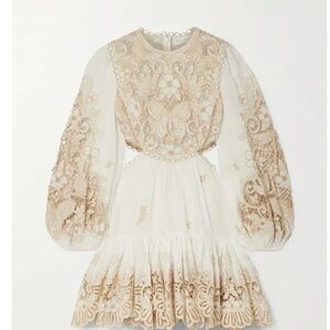 A signature piece from Zimmermann, the Jeannie mini dress showcases the brand’s renowned craftsmanship and romantic aesthetic. Crafted from lightweight linen, this exquisite design features intricate gold-toned embroidery layered over a soft ivory base, creating a refined yet ethereal effect.