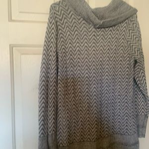 Large grey/black chevron design sweater. Made by Eight, Eight, Eight. Lightweight and soft. Swooped neck. Cut up the side 4-5” at hips for a comfortable fit.