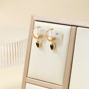 Women’s gold hoop earrings with black heart charms hanging. SOOO CUTE and perfect for Valentine’s Day!! NWT / never worn!! Approx 0.5” in size. So cute and dainty!