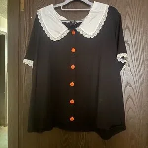 Stylish black top featuring a charming lace collar and vibrant orange pumpkin buttons. Length of top hits at the waist. Never worn.
