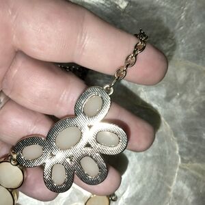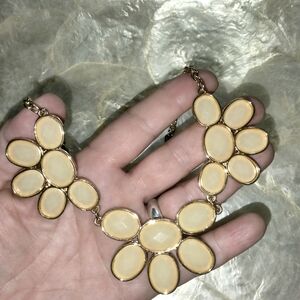 This elegant cream floral necklace adds a touch of sophistication to any outfit. Perfect for both casual and formal occasions. Pre loved but in great condition! Beige colored faceted pieces in gold tone metal