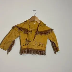 Vintage 1950s Walls of Texas Cowboys and Indians embroidered fringe jacket. Sanfordized, designed to look like buckskin. Has some flaws as shown, overall good condition for the age.