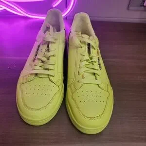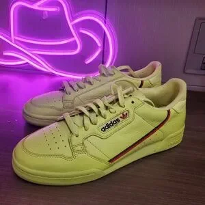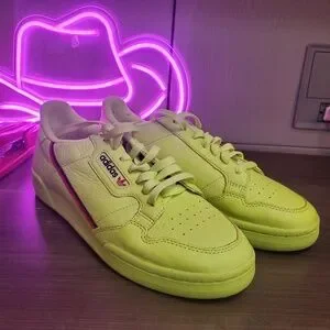 Great sneaker! Step into vibrant style with the adidas Continental 80 in a striking Semi-Frozen Yellow, a hue that's sure to turn heads and add a pop of color to any outfit. These sneakers are a size 9.5 US, 9 UK, and 43 1/3 EU, catering to men looking for a comfortable yet stylish athletic shoe. Crafted in 2018, the Continental 80 line pays homage to classic tennis fashion with a modern neon twist. The sneakers feature a non-customized, authentic design, encapsulated by the style code B41675, and are produced in Indonesia, ensuring quality and craftsmanship. Whether for casual wear or athletic pursuits, these shoes are a versatile addition to any footwear collection.